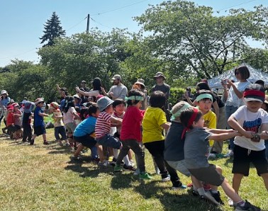 最終種目綱引きは、みんな最後の力を振り絞って思いっきり綱をひっぱりました。周りの保護者のみなさんも子ども達の真剣勝負に大声援で応援しました。勝ったチームも負けたチームも、「おもしろかった!」「もう一回やりたい」と、思い切り楽しんだようです。最後は恒例のお父さんチーム対お母さんチームの綱引き。こちらはお父さんチームの勝利でしたが、お母さんチームも大健闘でした!